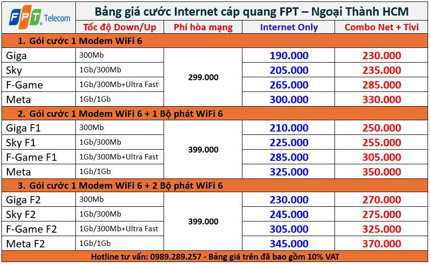 Hiện nay gói cước lắp mạng FPT Hồ Chí Minh đối với khu vực huyện có mức giá từ 190.000đ/tháng, tại Quận là 220.000đ/tháng tốc độ 300Mbps và nhiều lựa chọn khác tốc độ tới 1Gbps tuỳ nhu cầu. Dưới đây là các báo giá được cập nhật báo giá chính xác như sau: